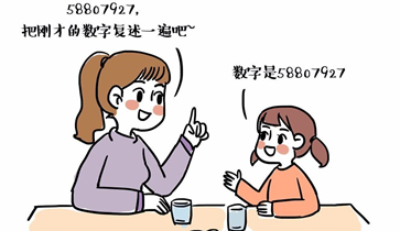 大人一開始先報簡單的幾位數,讓孩子復述,大人再不斷地增加一位數,讓孩子復述。每次只增加一位數。比如大人報“137”,孩子重復一遍,大人再報“1379”,孩子再重復,大人再報“13792”孩子再重復,以此類推。